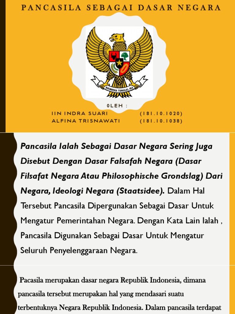 Pancasila sebagai dasar negara, sedangkan uud 1945 merupakan penjabaran dari isi pancasila. Fungsi dan peran pancasila tidak hanya sebagai dasar negara saja, tapi juga sebagai ideologi negara, falsafah negara dan jiwa bangsa. Nama pancasila ini terdiri dari dua kata dari sansekerta. Sebagai dasar negara kesatuan republik indonesia. Hakikat pancasila sebagai dasar negara.